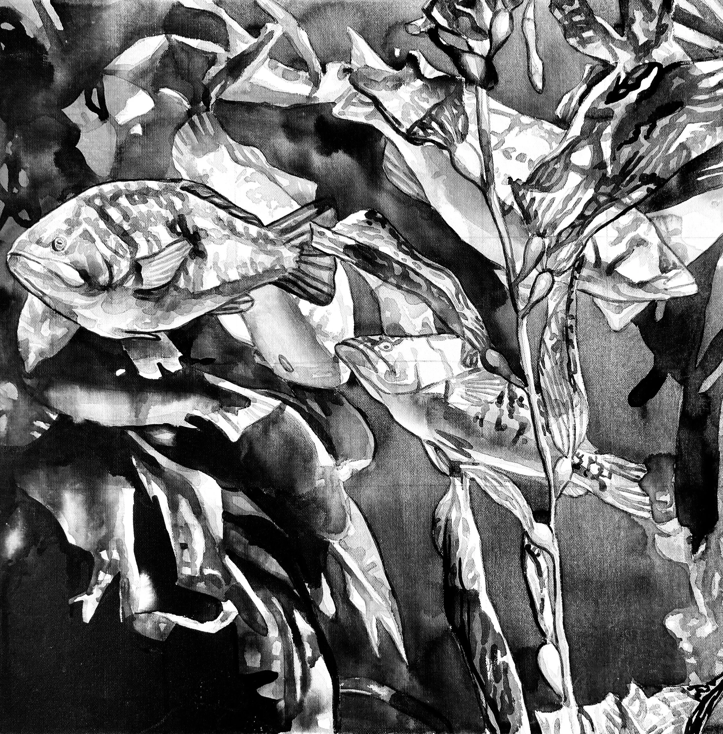 “Ocean Etudes” is a series of ink wash on canvas, worked transparently like watercolor. Photos are sourced from aquariums including Birch Aquarium in San Diego. Each work is an experiment with water-based techniques, using the fluid effects of ink to compliment the texture and high contrast lighting of underwater environments.